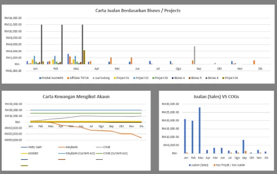 3 carta berasingan menunjukkan carta jualan berdasarkan untung rugi mengikut projects, carta kewangan mengikut akaun dan carta jualan berbanding kos jualan.