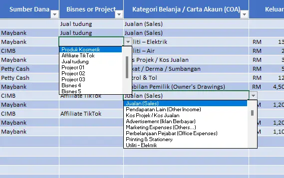 5. Dropdown menu untuk pilih akaun, Bisnes/project dan kategori belanja.