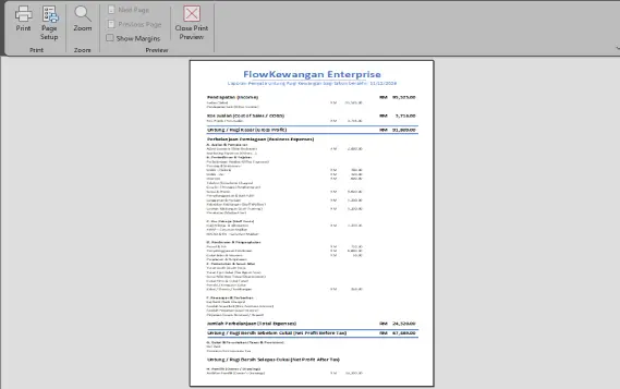 FlowKewangan Pro v2.6.1 menyediakan template khusus untuk menyiapkan laporan penyata untung rugi kewangan bagi tahun tersebut secara automatik setiapkali anda memasukkan data buku aliran tunai anda. Sangat memudahkan anda untuk menyediakan maklumat penting untuk laporan pengiraan sistem cukai di LHDN atau untuk memohon pinjaman bank.