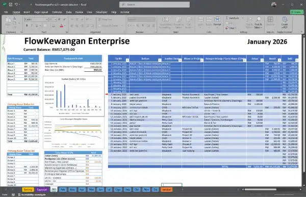 Bukan sekadar template – ni panduan lengkap urus aliran tunai! Selari dengan keperluan prinsip perakaunan SME Malaysia, SSM standard, dan use-case sebenar khusus untuk peniaga kecil, freelancer, Solopreneur, Kontrantor dan individu yang urus banyak akaun. Terus dapat lihat Buku Tunai, Penyata Untung Rugi & Carta Jualan.