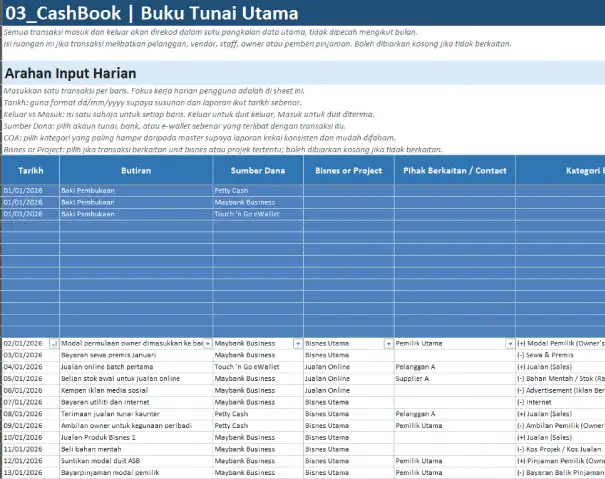 Sesuai untuk pemula yang mahu mula rekod duit masuk keluar bisnes dengan cara yang lebih teratur, mudah dan terus boleh guna.