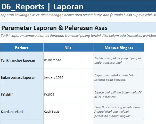 6. Sistem akan tunjuk parameter penting seperti tarikh anchor, bulan semasa laporan, FY aktif, kaedah rekod dan mata wang.