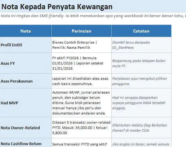 Sesuai untuk SME, solopreneur dan owner yang sudah melepasi tahap cashbook asas — siap dengan COA dinamik, semakan automatik, CEO Dashboard, Cash Flow, P&L, Balance Sheet, SOCE dan Accountant Pack dalam satu workbook.